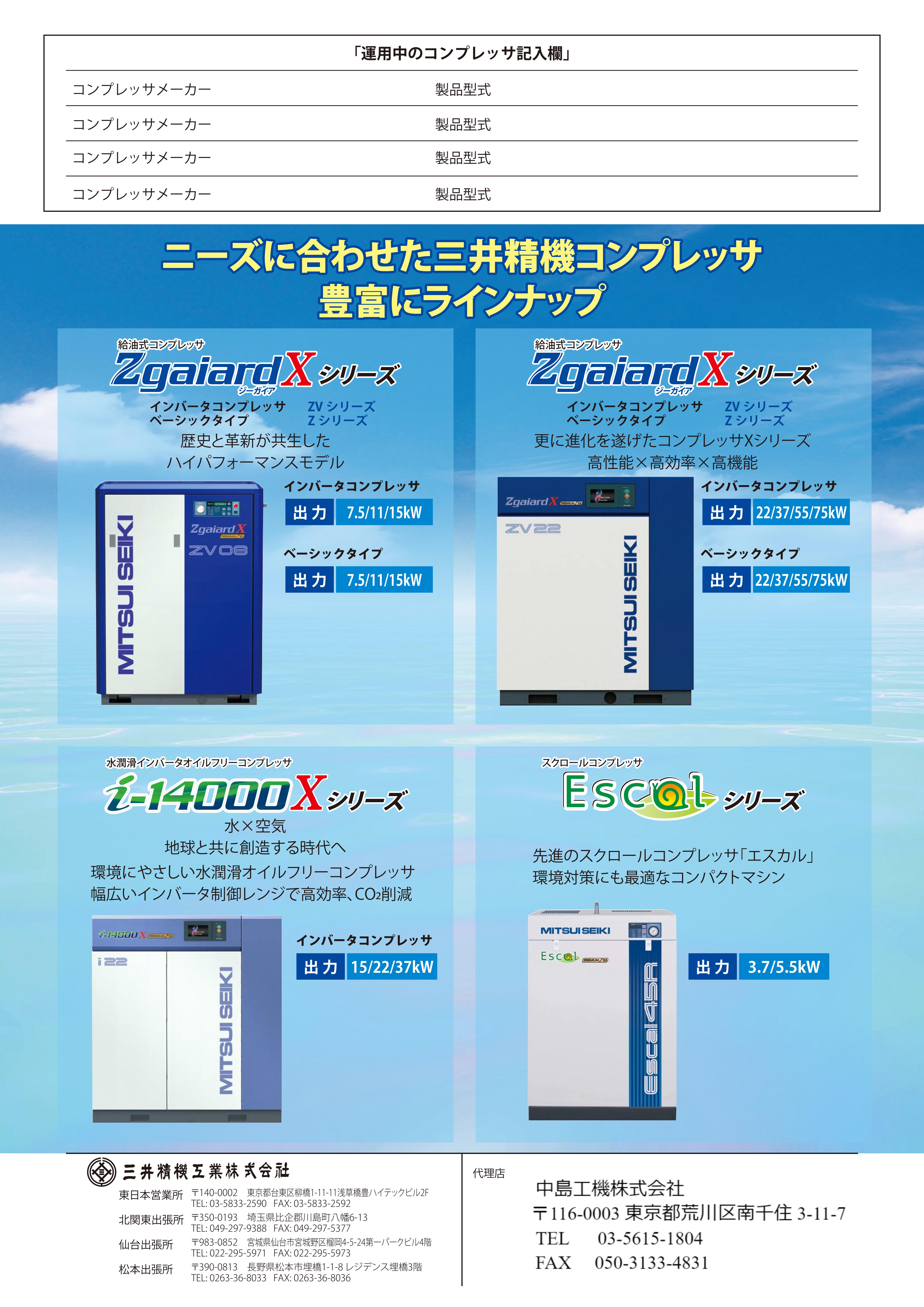 中島工機ホーム > 製品紹介 > 空圧・油圧製品 > 三井精機工業 > 三井精機コンプレッサ ZgaiardXシリーズ